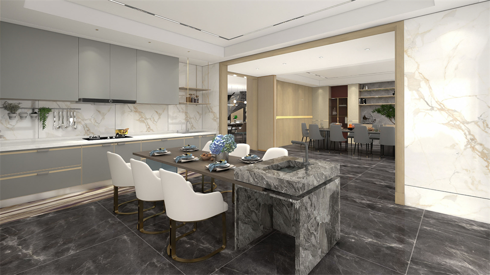 双层金属吊架,可放置不同规格调味罐,分类收纳,使厨房干净整洁岛台和餐桌一体,高低错开,丰富空间层次感,重燃光生活的热情与浪漫。